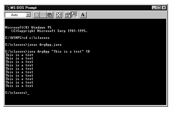 Of course, because SimpleApp ignores its parameters, the parameters in the command line don't mean anything. Suppose, however, you wanted to print a user-specified message a user-specified number of times. You might, then, write the Java application shown in Listing 32.2. When you run this application, add two parameters to the command line: the message to print (in quotes if the message is more than one word) and the number of times to print the message. You'll get output like that shown in Figure 32.3.