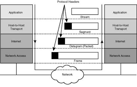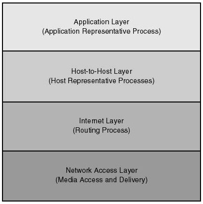 TCP/IP Protocol ArchitectureThe TCP/IP communications suite was designed with modularity in mind. This means that instead of developing a solution which integrates all aspects of communications in one single piece of code, the designers wisely chose to break the puzzle into its constituent components and deal with them individually while recognizing the interdependence tying the pieces together. Thus, TCP/IP evolved into a suite of protocols specifying interdependent solutions to the different pieces of the communications puzzle. This approach to problem solving is normally referred to as the layering approach. Consequently, hereafter, reference will be made to the TCP/IP suite as a layered suite of communications. Figure 20.1 shows the four-layer model of the TCP/IP communications architecture. As shown in the diagram, the model is based on an understanding of data communications that involves four sets of interdependent processes: application representative processes, host representative processes, network representative processes, and media access and delivery representative process. Each set of processes takes care of the needs of entities it represents whenever an application engages in the exchange of data with its counterpart on the network. These process sets are grouped into the following four layers: application layer, host-to-host (also known as transport) layer, internet layer, and network access layer. Each of these layers may be implemented in separate, yet interdependent, pieces of software code. Figure 20.1. Application Layer Application representative processes take care of reconciling differences in the data syntax between the platforms on which the communicating applications are running. Communicating with an IBM mainframe, for example, might involve character translation between the EBCDIC and ASCII character sets. While performing the translation task the application layer (for instance, application representative process) need not have (and shouldn't care to have) any understanding of how the underlying protocols (for instance, at the host-to-host layer) handles the transmission of translated characters between hosts. Examples of protocols supported at the application layer include FTP, TELNET, NFS, and DNS. Host-to-Host Transport Layer Host representative processes (for example, the host-to-host, or transport, layer) take care of communicating data reliably between applications running on hosts across the network. It is the responsibility of the host representative process to guarantee the reliability and integrity of the data being exchanged, without confusing the identities of the communication applications. For this reason the host-to-host layer is provided with the mechanism necessary to allow it to make the distinction between the applications on whose behalf it is making data deliveries. In other words, assume that two hosts, tenor and alto, are connected to the same network, as shown in Figure 20.2. Furthermore, assume that a user on host alto is logged in to FTP on host tenor. Also, while using FTP to transfer files, the user is utilizing TELNET to login in to host tenor to edit a document. In this scenario, data exchanged between both hosts could be due to TELNET, FTP, or both. It is the responsibility of the host-to-host layer, hereafter called the transport layer, to make sure that data is sent and delivered to its intended party. What originates from FTP at either end of the connection should be delivered to FTP at the other end. Likewise, TELNET-generated traffic should be delivered to TELNET at the other end, not to FTP. To achieve this, as will be discussed later, the transport layer at both ends of the connection must cooperate in clearly marking data packets so that the nature of the communicating applications is easily identifiable. Protocols operating at the transport layer include both UDP (User Datagram Protocol) and TCP (Transmission Control Protocol). Later sections will cover the characteristics of both protocols. Figure 20.2. Internet Layer The internet layer is responsible for determining the best route that data packets should follow to reach their destination. If the destination host is attached to the same network, data is delivered directly to that host by the network access layer; otherwise, if the host belongs to some other network, the internet layer employs a routing process for discovering the route to that host. Once the route is discovered, data is delivered through intermediate devices, called routers, to its destination. Routers are special devices with connections to two or more networks. Every router contains an implementation of TCP/IP up to and including the internet layer. As shown in Figure 20.3, hosts alto and tenor belong to different networks. The intervening networks are connected via devices called routers. For host alto to deliver data to host tenor, it has to send its data to router R1 first. Router R1 delivers to R2 and so on until the data packet makes it to host tenor. The "passing-the-buck" process is known as routing and is responsible for delivering data to its ultimate destination. Each of the involved routers is responsible for assisting in the delivery process, including identifying the next router to deliver to in the direction of the desired destination. The protocols that operate at the internet layer include IP (Internet Protocol), and RIP (Route Information Protocol) among others. Figure 20.3. Network Access Layer The network access layer is where media access and transmission mechanisms take place. At this layer, both the hardware and the software drivers are implemented. The protocols at this layer provide the means for the system to deliver data to other devices on a directly attached network. This is the only layer that is aware of the physical characteristics of the underlying network, including rules of access, data frame (name of a unit of data at this layer) structure, and addressing. While t