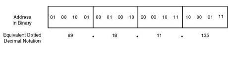 You can invoke ICMP by using the UNIX ping command to check on the reachability of a remote host as shown here: # ping 123.5.9.16 123.5.9.16 is alive ping invokes an ICMP echo request message that is sent to the designated host. If, upon receiving the echo request, the host responds with an ICMP echo response message, it is reported as being alive (as shown in the example), and hence, reachable. Otherwise, the host is deemed not reachable. IP Address Structure In TCP/IP, every device on the network derives its unique complete network address by virtue of an address assignment to which the device is configured (more on configuration later in the chapter). The reason the address is termed complete is because it is pretty much all that is needed to locate it on the network regardless of its size (similar to the postal address, which completely describes your home address--thus helping others to unambiguously locate you). The assigned address is known as a symbolic IP address, and is made up of two parts: 1) the network address, which is common to all hosts and devices on the same physical network, and 2) the node address, which is unique to the host on that network. As you will see, neither part has anything to do with the actual hardwired MAC address on the network address card. As a matter of fact, a network administrator has the freedom to change the node part of the address (with some restrictions), and to a lesser degree the network address, irrespective of the MAC address. For this reason, the address is described as symbolic. Confusing as it may initially sound, the IP protocol uses these symbolic addresses to route data on the network. In other words, when a user requests that a telnet session be established with another host, TCP/IP uses the administrator assigned 32-bit IP addresses in order to connect and establish the telnet session between both the requesting and the target hosts. The details of this are going to be tackled later in the chapter (refer to the "Address Resolution Protocol" section. First, have a look at how IP addresses are made, and the classes to which they belong. The IP address is 32 bits (or four bytes) long, including both the network and the node addresses, and it occupies the IP source and destination address fields of the IP header. How many bits of the address belong to the network part, versus the number of bits that belong to the node part is dependent on the IP address class into which the address falls. IP defines three main classes: A, B, and C. There is a class D, which is lesser in significance than the other ones and will be touched on very briefly. Figure 20.10 shows the different address formats corresponding to each of the three main classes that IP supports. Each IP address class is distinguishable by the very first few bits of the network portion. The following is a listing of the different IP classes and the rules by which they are governed: Figure 20.10. Class A address: The first bit is fixed to 0, and the first byte is called the network id and identifies the network. The remaining three bytes are used to identify the host on the network, and comprise the host id. It can be calculated that there is a maximum of 127 class A networks, with each capable of accommodating millions of hosts. Class B address: The first two bits are fixed to 10, the first and second byte are used to identify the network, and the last two bytes are used to identify the host. There can be 65,535 hosts on class B networks, capable of accommodating thousands of hosts. Class C address: The first three bits are fixed to 110, the first, second, and third bytes are used to identify the network, and the last byte is used to identify the host. Class C networks are the smallest of all classes, as each can accommodate a maximum of 254 hosts (not 256, because 0x0 and 0xFF are reserved for other purposes). With three bytes reserved to identify the network, millions of class C networks can be defined. Class D address: The first four bits are fixed to 1110. A class D address is a multicast address, identifying a group of computers that may be running a distributed application on the network. As such, class D does not describe a network of hosts on the wire. To make address administration a relatively easy task, TCP/IP network administrators can configure hosts, and routers, with addresses by using what is commonly known as dotted decimal notation. Dotted decimal notation treats the 32-bit address as four separate, yet contiguous, bytes. Each byte is represented by its decimal equivalent, which lies between 0 and 255 (the decimal range equivalent to an 8-bit binary pattern). Figure 20.11 shows an example of a class A address in both binary and dotted decimal (69.18.11.135) notation. Figure 20.11. Given that an 8-bit binary pattern can assume any decimal equivalent in the range of 0 to 255 and given the initial bits of a certain class, you should be able to tell from the first byte the class of the network. Table 20.1 below depicts the range of values for the first byte of each of the IP address that classes can assume. Table 20.1. IP address classes and the range of values their respective first byte can assume.