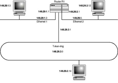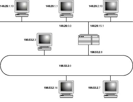 Consider the address 148.29.4.121. By applying the rules learned above, it can be determined that this is a class B address, since the first byte lies in the 128 to 191 range of values. And since a class B address has the first two bytes for a network address, it can be derived that the network address is 148.29 while the host address is 4.121 on that network. To generalize, given an IP address, its class can be recognized by interpreting the first byte. Consequently, the network portion of the address can be derived from the remaining bytes. Figure 20.12 shows an example of a class B network. Notice how all the hosts have the 148.29 network address in common. A host misconfigured (for example, host X in Figure 4.4b) to any other network address will not be able to talk to other hosts on the network, be it on same physical network or other router connected networks. When a host or any other network device is assigned an IP address, IP derives its network class and network address from that assignment (148.29). Later, when it is required to deliver a datagram to a host, it compares the network address of the destination address submitted by the transport protocol (TCP or UDP) to that of its own. If the addresses match, IP refrains from routing the datagram (as explained earlier, the datagram won't be sent to a router for assistance in delivery). Instead, IP assumes that the host is on the same network and, therefore, attempts a direct delivery to the designated node address. Figure 20.12. Assuming that you are on host X and want to establish a file transfer session with host A on the network, you can enter the command: ftp 148.29.1.10 Refer to the "Domain Name System" section later in this chapter to learn how to specify a host using a name instead of the IP address. TCP picks up the address and passes it to IP, at the Internet layer, along with a TCP segment (which in turn contains the user request for FTP connection) that it wants delivered to host A. IP, on host X, compares its own network address (147.29) with that of host A (148.29). Since they are not the same, IP concludes that host A must belong to a remote network, and therefore direct delivery is not possible. For simplicity, assume that the network in Figure 20.4b is the only one in its environment, in which case there can be no routers on the wire. IP won't be able to forward the packet any further and will report a failure to deliver to the upper layer or application. In Figure 20.13 you are shown two networks, a class B Ethernet network and a Token-ring class A network. A router is also shown connecting the two networks. An important observation to make is that the router is configured to two addresses, 148.29.15.1 and 198.53.2.8. The question that normally arises is, which of the two is the address? Well, as a matter of fact an address which you assign to the host is assigned to, or associated with, the network interface card that attaches the host to the network. Hence, in the case of a router and multihomed host, an address is required for every NIC card supported. Depending on which network the NIC attaches the host to, it must be assigned an IP address with a network part consistent with the network address assigned to the rest of the hosts community. Hosts on the Token-ring network use 198.53.2.8 to address the router, whereas those on Ethernet use 148.29.15.1. Figure 20.13. You saw earlier that all 0s and all 1s (0x0 and 0xff, respectively) are reserved for special purposes, and therefore cannot be used to designate a node on the network. This is because an all 0s node address refers to all nodes on the network. For example, in the routing table of the router in Figure 20.13, a destination address of 198.53.2.0 refers to all hosts on the Token-ring network . While an all 1s node address is normally used to broadcast a message to all hosts on that network. Therefore, a host transmitting a broadcast message to 198.53.2.255 will have the message picked up by all active hosts on the Token-ring network only. Similarly, a broadcast to 148.29.255.255 will be picked up by all hosts on the Ethernet. In addition to the reservations made on the node addresses described above, there are two class A network addresses that bear a special significance and cannot be used to designate a network. They are network addresses 0 and 127. Network 0 is used to designate the default route, whereas 127 is used to designate this host or the loopback address. As explained previously (refer to the "Data Routing" section) in this chapter, the default route refers to a router configuration that makes the routing of packets to destinations that are unknown to the router possible. The loopback address is used to designate the localhost and is used to send to the interface an IP datagram in exactly the same way other interfaces on the network are addressed. Conventionally, 127.0.0.1 is the address which is used to designate the local host. You can, however, use any other class A 127 address for the same purpose. For example 127.45.20.89 is valid for designating the local host as is the 127.0.0.1. This is because a datagram sent to the loopback interface must not, in any case, be transmitted on the wire. Subnet Mask Class B networks accommodate approximately 65,000 hosts each, whereas Class A networks accommodate thousands of nodes. In practice, however, it is not feasible to put all on the same network. Here are two considerations: