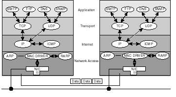 The Network Access LayerThe network access layer is responsible for the delivery of data to devices connected to the same physical network. It is the only layer that is aware of the details of the underlying network. In other words, the network access layer is aware of details such as the media type (unshielded twisted pair, fiber, coax, and so on), electronic encoding of data, and media access method. Given that TCP/IP formalizes the exchange of data across protocol boundaries in the same host, you can see how a new network access technology can be implemented without affecting the rest of the protocol hierarchy. Ethernet and Token-ring are examples of underlying technologies that the network access layer relies on to receive data from, or deliver data to, the network. The network access layer implementation includes the network interface card (that is, the communications hardware) that complies with the communications media, and the protocols that handle all the action (see Figure 20.5). An example of protocols implemented at this level is the Address Resolution Protocol (ARP, discussed in the "Address Resolution Protocol" section), which takes care of mapping the IP symbolic address to the corresponding hardware (MAC) address. It is worth noting from the diagram, that not all data that the network interface card (NIC) receives from the network is passed up the layer hierarchy. Some data might have to be passed by the MAC driver to adjacent protocols coexisting with the driver at the network access layer (for example, Reverse Address Resolution Protocol, discussed later in the chapter). This feature is commonly known as data multiplexing. Figure 20.5. Among other functions, the network access layer encapsulates data that is passed to it by the internet layer into frames for subsequent delivery to the network. Keep in mind, however, that the frame format is a function of the media access technology in use, whereas the data format of upper layer protocols never changes. The Internet LayerTwo protocols are implemented at this level: the Internet Control Message Protocol (ICMP, RFC792), and the Internet Protocol (RFC791). The purpose of the Internet Protocol (IP) is to handle routing of data around the internetwork (commonly known as the internet), while that of ICMP is to handle routing error detection and recovery. IP is the cornerstone of the TCP/IP suite of protocols. All TCP/IP protocols communicate with their peers on the network by riding IP datagrams. Figure 20.6 shows the data structure of the IP datagram (including both the IP header and data passed on from the layer above). IP's header fields are presented in the following discussion of its functions. But first, take a look at its two main characteristics. Figure 20.6. Main Characteristics of IP IP is a connectionless protocol. This means that IP does not attempt to establish a connection with its peer prior to sending data to it. A connection oriented protocol undergoes a sort of handshake with its peer in the remote system; the purpose of the handshake is twofold: it verifies the readiness of the remote peer to receive data before it is sent; and during the handshake both ends of the connection try to reach a mutual agreement on some of the parameters that should govern the data exchange process. An example of a negotiated parameter is the maximum size of the data unit that can be exchanged during the connection. In addition to being connectionless, IP delivers an unreliable service. The unreliability stems from the fact that IP does not provide error detection and recovery. All that IP cares about is the delivery of data to its designated destination. What happens to the datagram during shipment is a concern that is delegated, by design, to IP service users (higher layer protocols). This is very much similar to the postal service, which delivers mail on a best effort basis, while not caring about the quality of what is being shipped or received. Functions of IP IP functions include: Data encapsulation and header formatting Data routing across the internetwork Passing data to other protocols Fragmentation and reassembly Data Encapsulation Data encapsulation involves accepting data from the transport layer, and adding to it IP's header control information. As shown in Figure 20.6, the IP header is five or six 32-bit words in length; this is because the sixth word is optional, justifying the IHL field (the Internet Header Length). The first field refers to the version of IP in use, with the current one being number 4. The third field is the type-of-service field (TOS). TOS can be set to specify a desired class of service, as requested by applications. Examples of class of service supported by IP are: minimum delay, which is requested by application protocols such as RLOGIN and TELNET, and maximum throughput, which is requested by applications such as FTP and SMTP. The total length field minus the IHL field indicate to IP the length of the data field. Both the identification and fragmentation fields will be discussed under Fragmentation and Reassembly below. The time to live (TTL) field is initialized by IP to the upper limit on the number of routers that a datagram can cross before it ultimately reaches its destination. Assuming that TTL was set to 32, it is decremented by one by each router it crosses. As soon as TTL reaches zero, the datagram is removed by the next router to detect the anomaly. The underlying idea is that with TTL, a lost datagram can be stopped from endless looping around the network. The protocol number field will be discussed later in this section. Although IP is an unreliable protocol, in the sense that it does not perform error detection and recovery, it still cares about the integrity of its own control information header. With the help of the header checksum, IP verifies the integrity of data in the header fields. If the integrity check fails, IP simply discards the datagram. IP does not communicate a n