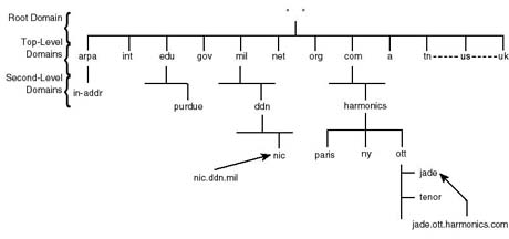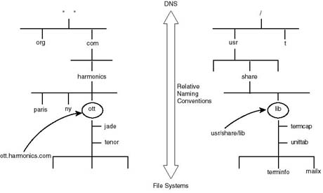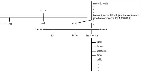 As shown, each entry consists of an IP address, the host name associated with the IP address, and, optionally, an alias, where an alias is another name for the same host in question. For example, jade and jade.harmonics.com refer to the same host (that of IP address 100.0.0.2). For a user to establish a telnet session with jade, he has the choice now of entering: $ telnet jade or $ telnet jade.harmonics.com All TCP/IP applications, such as telnet and ftp, have a built-in name resolution mechanism that looks at the host's table and returns the corresponding IP address to the invoked application. The application then proceeds to contacting the corresponding host across the network. Failure to resolve the name to an IP address normally results in the error message "Unknown host". Domain Name System The host's table-based approach to name resolution is convenient for reasonably small networks with few entries to include in the /etc/hosts file, provided that these networks are not connected to the Internet and have no need to run DNS services. Even if the network is not connected to the Internet, the idea of maintaining identical /etc/hosts files on all UNIX hosts is a time-demanding idea as it requires that changes made to one must be consistently implemented in all others. An approach that can easily become nightmarish as the size of the network increases. Domain Name System (DNS, RFC 1035) is an alternative way to performing name resolution. Using DNS to resolve host names to IP addresses involves the use of a global, hierarchical and distributed database containing information (including IP addresses) about all hosts on the network as well as those on the Internet. The hierarchy allows for the subdivision of the name space into independently manageable partitions called domains (or subdomains). The distributed nature allows for the relocation of partitions (subdomains) of the database onto name servers belonging to sites around the network or the Internet. Consequently, sites hosting name services can be delegated the responsibility for managing their subdomains. A name server is a host maintaining a partition of the DNS database and running a server process (on UNIX it is called named daemon) that handles name-to-IP address resolution in addition to providing some other pertinent host information. TCP/IP applications have the DNS client component, known as the name resolver, built into them. In other words, no special UNIX daemon is required to support name queries on behalf of applications. Figure 20.21 shows how a name query is handled as a user enters the ftp jade.harmonics.com to start a file transfer session. Host name jade.harmonics.com is the fully qualified domain name (FQDN) by DNS naming rules, which will be shortly discussed. According to the diagram, resolver routines, included in the ftp client, package the name in a DNS query and send it to a DNS server that the host is configured to recognize. The DNS server looks up the requested information (in the case, the IP address) and sends a reply to the requesting host. Figure 20.21. Logical Organization of DNS When setting up DNS, you ought to follow certain rules in organizing your domain. Understanding those rules is as important to the proper implementation of DNS as understanding the rules which govern file system organization for the effective administration of you UNIX system. The Internet's DNS organization will be used throughout the chapter to illustrate DNS concepts. Also, a fictitious subdomain (harmonics.com) will be introduced to illustrate some of the associated concepts at this level. It is important that you keep in mind that your situation may dictate a different organization from the Internet's. The rules and concepts, however, are still the same. DNS is a hierarchical database of host information. Its structure resembles, to a great extent, that of computer file systems. Figure 20.22 draws an analogy between the organization of DNS and that of the UNIX file system. In both cases, the organization follows that of an inverted tree with the root at the top of the structure. Where the root of the file system is written as a slash "/", that of DNS is written as a dot "." representing the null "" character. Below the root level, the upper most domain is defined and may be subdivided into domains, which can then be further divided into subdomains--similar to dividing the UNIX file system into subdivisions called directories and subdirectories. Each subdomain is assigned a name (or a label), which can be up to 63 characters long, and can be divided further into subdomains. DNS allows nesting of up to 127 domains in one tree. Figure 20.22. Each domain (or subdomain) represents a partition of the database, which may contain information about hosts in that domain, and/or information about lower domains (using the file system analogy, a directory or subdirectory represents a partition of the file system where information about both files and lower subdirectories is kept). A directory, or file, under the UNIX file system, can be referred to using relative paths or an absolute path specified relative to the root. The lib directory in Figure 20.22b can be referenced relative to its parent share directory, or relative to the root "/", to become /usr/share/lib. In a similar fashion, a domain under DNS can be referred to relative to its parent domain using its name only, or relative to the root domain. A domain name specification relative to the root is known as fully qualified domain name (FQDN). As Figure 20.23 illustrates, an absolute file or directory name is written as a sequence of relative names from the root to the target directory, or filename. Under DNS, a fully qualified domain name is written as a sequence of labels, starting with the target domain name and ending at to the root domain. For example, ott.harmonics.com is the fully qualified domain name of the subdomain ott. Figure 20.23. To translate these into real 