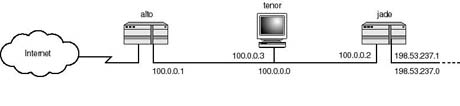 The above completes the list of the minimal requirements for the graceful implementation of TCP/IP on UNIX hosts. There are situations where configuring hosts may require additional information. Additional information can, however, always be implemented after all the above parameters are taken care of and the network setup is verified to work satisfactorily. TCP/IP Setup FilesInstalling and configuring TCP/IP involves several files that you are required to be aware of. Each of the files depicted below takes care of a certain aspect of the TCP/IP services rendered by the UNIX host. /etc/hosts The /etc/hosts file is where the host names to IP address associations are maintained. The following is an example of an /etc/hosts file as it is on host jade (see Figure 20.29): # # Internet host table # # IP address hostname aliases # 127.0.0.1 localhost 100.0.0.2 jade 198.53.237.1 jade1 # jade's second interface 100.0.0.3 tenor nfsserver # is my nfs server 100.0.0.5 alto # my gateway to the internet Figure 20.29. Text following the # character is ignored, and is meant to include comments and documentation. As shown above, every file entry consists of an IP address, the corresponding hostname, and optional aliases. Three entries in this file pertaining to host jade are of particular interest: