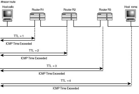 traceroute: Lead Me To Rome There are situations when the problem of unreachability is mainly attributable to routing configuration problems. What might make troubleshooting the routing problem even worse is the number of intervening routers between the source and destination hosts. To help you out with situations involving a large number of routers, UNIX comes equipped with an easy to use yet powerful traceroute command. Using traceroute, you can trace the path a data packet takes from one host to another on the network. The command output includes one line per router that the packet traverses. The lines includes the IP address of the router being traversed, the hop count (that is, number of intervening routers between the host and the router being described) and the round-trip times in milliseconds. The maximum number of hops that traceroute supports is 30. To trace the route to a host, or any other network device, simply enter: # traceroute hostname In the following example traceroute is used to trace the route to host rome: # traceroute rome traceroute to rome (148.53.27.11), 30 hops max, 40 byte packets 1 198.237.53.1 (198.53.237.1) 5 ms 5 ms 4 ms 2 198.235.54.2 (198.235.54.2) 6 ms 6 ms 4 ms 3 143.22.45.9 (142.22.45.9) 11 ms 8 ms 7 ms 4 169.48.1.158 (169.48.1.158) 28 ms 28 ms 24 ms According to this example, to get to host rome a packet, originating from the workstation where traceroute was issued, has to traverse four routers in the listed order. The way traceroute works is illustrated using Figure 20.34. Early in the chapter, it has been explained that how long a data packet can spend on the network is determined by the contents of the time-to-live (TTL) field included in the IP header. Every router that the packet traverses decrements the field by one. Once TTL is decremented to zero the packet is removed from the network by the first router to detect the condition. traceroute capitalizes on this control mechanism. Once invoked, it issues up to 30 UDP packets, in sequential order, in which the first packet has its TTL set to one. Each subsequent UDP packet has its TTL incremented by one relative to the last packet. In practical terms this means that the first packet is bound to die as soon as it hits the first router on its way to the destined host (that is, rome in the diagram). The second UDP traceroute packet makes it through router R1 only to die at the door steps of router R2 (since its TTL is set to 2 only). Every time a router kills a packet, it is compelled (by design) to return an ICMP Time Exceeded message to the originating host. Figure 20.34. This chain of events continues until the target host is reached. To elicit a response from the target host, traceroute destines the UDP packet to port 33434 - a reserved invalid port number. Being an invalid port number forces the receiving host to ignore the packet and respond with an ICMP Unreachable Port (not Time-Exceeded) message. Upon receiving this last message, traceroute stops sending diagnostic UDP packets. Here is a sample output illustrating what would happen should traceroute fail to reach the target host: # traceroute rome