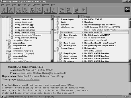 Another excellent source is the USENET Information Center. This provides a hypertext-based index that covers the vast majority of available newsgroups, providing a FAQ for each one. The USENET Information Center can be found at the following URL--http://sunsite.uuc.edu/usenet-i/. News Transport Software DocumentationThere are a number of available News transport systems; some of the most commonly recommended include C-news, InterNetworkNews (INN) and Netscape's News Server. All these packages come with extensive documentation to help you install and maintain them. Whichever you choose, read the documentation and then read it again. This chapter is no substitute for the software author's documentation, which is updated to match each release of the software and which contains details that a chapter of this size can't cover. Request for Comments (RFC) DocumentsRFCs are issued by working groups of the Internet Engineering Task Force (IETF). They were known initially as requests for comments, but as they become adopted as Internet standards, you should think of them as requirements for compliance--if you want to exchange news with another Internet NNTP site, you must comply with the provisions of both RFC 977 and 1036. RFCs are available for anonymous ftp on the host ftp://ftp.internic.net and others. The RFCs mentioned here are also included on the UNIX Unleashed CD-ROM.