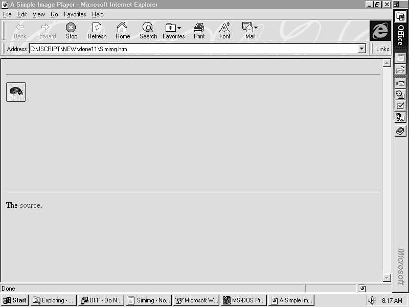 The real power of Java comes through in its capability rapidly to display multiple images, giving the appearance of true animation on a Web page. You now have enough knowledge about Java threads and also about the AWT that you can present a simple image viewer applet in Java. This applet provides the first concrete example of something that would be difficult to accomplish in JScript. This applet can also be used as a template for writing more sophisticated applets that use Java threads. The code for the image viewer is shown in Listing 11.5. This code appears in the file Simimg.java on the CD-ROM.