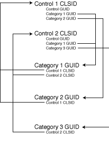 Component categories are a natural extension of this process. They allow a control to describe its functionality in far more detail than plain OLE interface signatures. When a control self-registers in the system registry, it adds entries under its CLSID for the GUID for a control, the GUID for each category that it supports, and the GUID of each category that it requires support for from a container in order to function properly. Additionally, it registers its own CLSID under each category registry entry (see Figure 13.2).