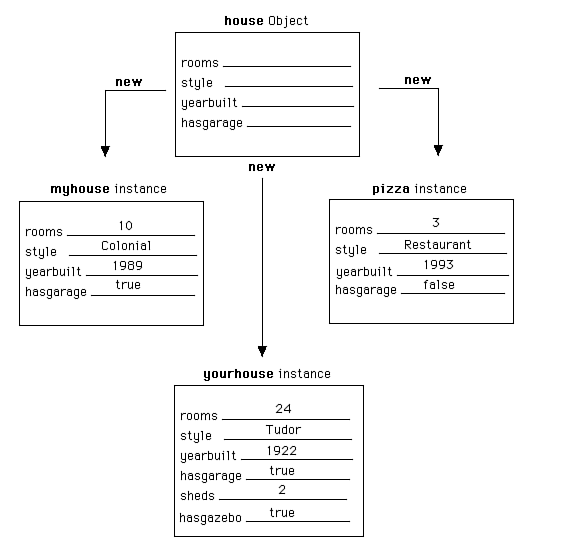 This example shows how a house object is defined. It does not create a specific house instance. The house object has four slots to hold the four properties: rooms, style, yearbuilt, and hasgarage. A specific house instance will fill those slots with actual values. Instances are created using the new statement combined with a function call. The keyword new is required, because it tells JScript that we are creating an instance rather than just calling a function. We could create an instance of house, named myhouse, as follows: