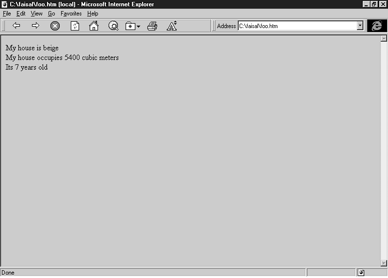There are several things to notice about this object definition. First of all, the name of the function is the name of the object: house. Second, this function does not return anything. When functions were first introduced in Chapter 2 "JScript: The Language," it might have seemed mysterious how a function could actually do useful work without a return statement, because everything inside a function is local. Using a function to create an object works by modifying this, so that it need not return anything. You can also have the function return(this). Using this explicit return statement has the same effect as the code shown in Listing 4.1.