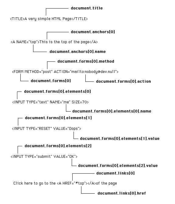 These properties of the document object are arrays representing every HTML element that is an anchor, form, or link on the page. In our particular example, there is only one of each, so we would refer to the anchor at the top of the page as document.anchors[0], the link at the bottom of the page as document.links[0], and the form in the middle of the page as document.forms[0]. These are the top-level HTML objects represented by this document. Each of these elements, in turn, has properties and methods that can be used to describe and manipulate it.
