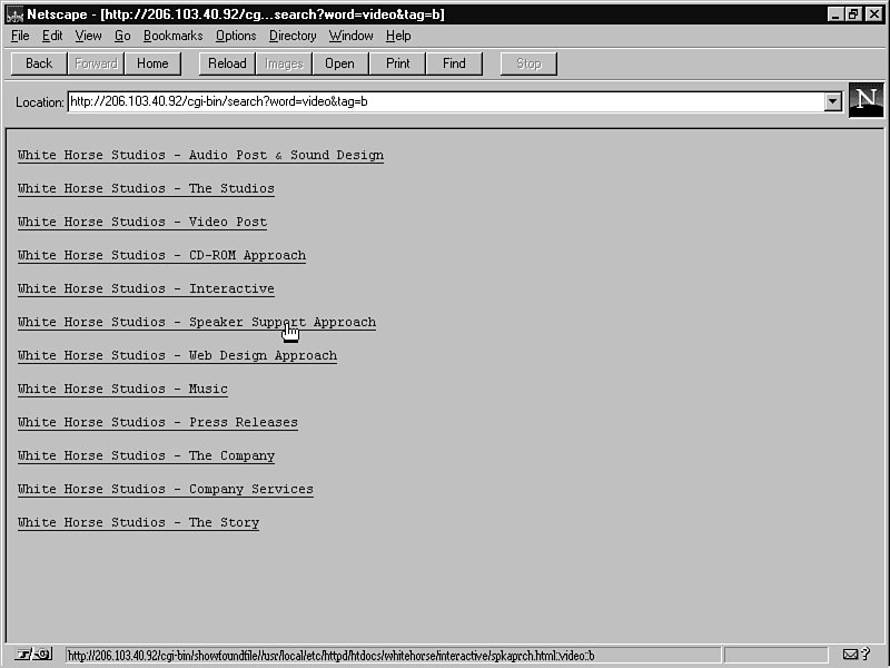 As I described this script, you may have noticed that it is not perfect. The script requires all the HTML files to have a body tag, for example; it needs img and a tags to start on the same line as their src and href attributes. The script also may behave poorly if the search text was an HTML tag or an attribute to a tag. In the applications in which I've employed this system, these facts didn't matter, because the sites had solid HTML code to begin with-and also were sites whose users were extremely unlikely to search for HTML tags and attributes. You will want to take these limitations into consideration before you implement a search of this kind; you may need to modify it to fit your needs.