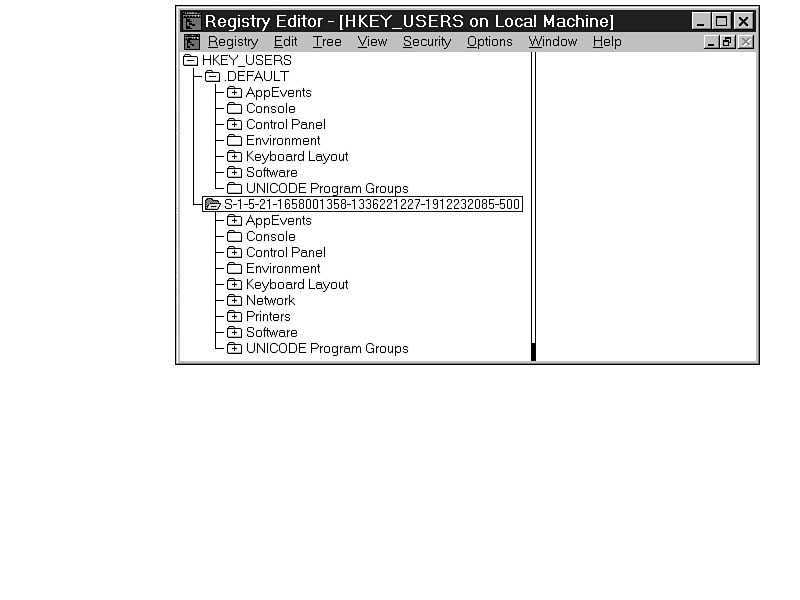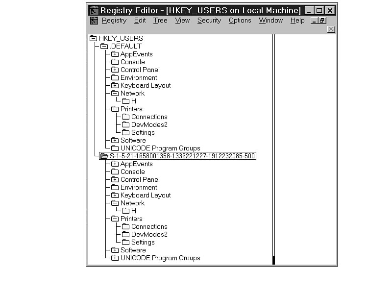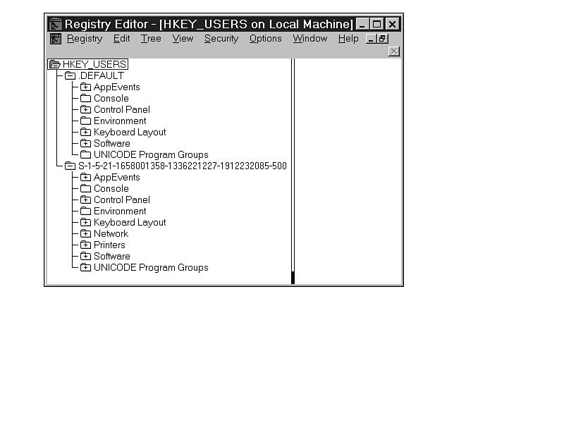 WinlogonHKEY_USERS\.DEFAULT\Software\Microsoft\Windows NT\CurrentVersion\Winlogon This setting controls the logon functions for Windows NT. Unicode Program GroupsHKEY_USERS\.DEFAULT\UNICODE Program Groups The default Unicode program groups are only available when using Program Manager. Explorer does not use them. S-1-5-21-1658001358-1336221227-1912232085-500 (SID)HKEY_USERS\S-1-5-21-1658001358-1336221227-1912232085-500 This is the SID for the currently logged-on user. Every user on the network is assigned a SID by User Manager for Domains, and each SID is unique, so depending on who is logged on, this information changes. It is pulled from the NTUSER.DAT file in the user's profile. Generally, the subkeys are more extensive, based on the software installed, the choices made, and the resulting settings.
