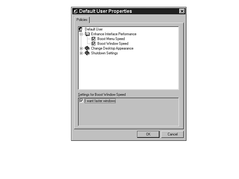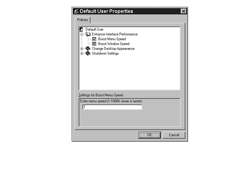 The resulting System Policy Editor entries are shown in Figures J.1 through J.5. Figure J.1 shows the result of the MenuShowDelay function in Listing J.1. The !!Speed string (as a category name) is replaced by the Enhance Interface Performance text in Figure J.1. Improving performance is also the goal of the MinAnimate portion of the template in Listing J.1. Figure J.2 shows the result of the template in the System Policy Editor screen. Figure J.1. Boosting the menu speed with System Policy Editor. Figure J.2. Removing the window animation with System Policy Editor.