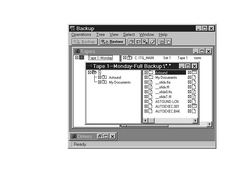would like to use. If you want to restore only part of the current tape set (only some of the directories or files), double-click the tape-set name. NT Backup performs a Catalog Status procedure to list all the files that are contained on the tape. This procedure is very similar to a DIR command in DOS, except that it takes longer. Select and deselect files as necessary (as Figure 5.4 illustrates). After you choose the files and directories, confirm the options for the restoration with Operations | Restore. If you want the Registry to be restored to the local system, you must select it in the dialog box shown in Figure 5.5. Selecting the files in the catalog is not enough. If you do not select Restore Local Registry from the Restore Information dialog box, you will receive a File in Use error, and the files will not be restored. Figure 5.4. Choose which directories and files will be restored. Figure 5.5. The Restore Information dialog box.