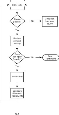 The Registry plays a key role in making all the devices work. If the Registry is corrupted, and the settings are not available, the device will not work. Figure 12.2. Windows NT hardware settings resolution process.