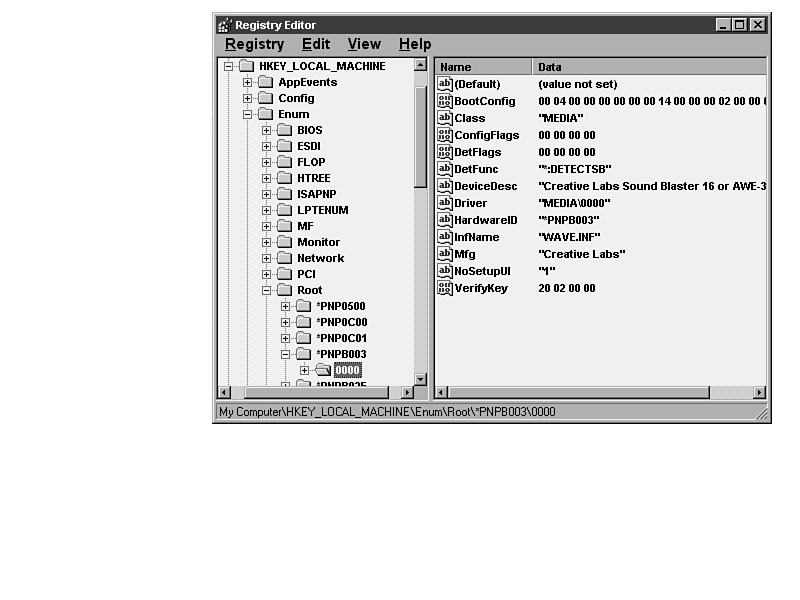 When Plug and Play sets the configuration, it is stored in HKEY_DYN_DATA and then copied to HKEY_LOCAL_MACHINE as a backup. In HKEY_LOCAL_MACHINE, the configuration information is held in HKEY_LOCAL_MACHINE\Enum\Root for most devices. Figure 12.5 shows the binary Settings value, indicating that it has been set through Plug and Play. Figure 12.5. Binary Settings information for COM3.