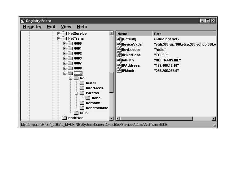 The settings for the protocols are in HKEY_LOCAL_MACHINE\System\CurrentControlSet\ Services\Class\NetTrans, for network transport. That is where the IP addresses are held for TCP/IP, the frame types for NetWare networking, and other details about the transport protocols. Figure 19.3 shows the TCP/IP settings, which are in the 0009 key. Figure 19.3. TCP/IP settings in the Windows 95 Registry.