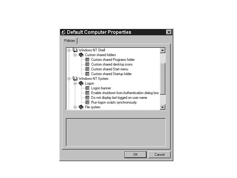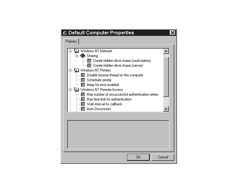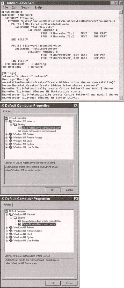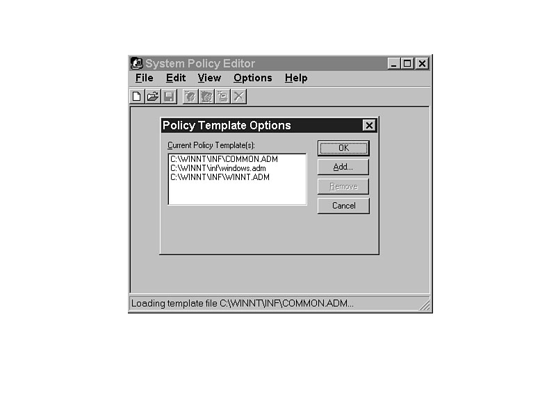 Default Templates in Windows NT 4.0Three default templates come with Windows NT 4.0: COMMON.ADM, WINNT.ADM, and WINDOWS.ADM. Because the System Policy Editor does not work with Windows 95 systems, the WINDOWS.ADM file will not be discussed in depth here. It was developed so it could be used in creating a single policy for both NT and 95. It actually has no value now because the policies are not compatible.