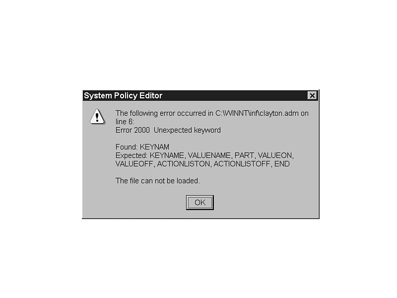 The template files are not case-sensitive, but it is critical to have the correct syntax, or structure. Incorrect syntax prevents the file from loading (as shown in Figure 29.5) and returns an error message regarding the type of error and the line on which it occurred. Figure 29.4. The template files loading into System Policy Editor. Figure 29.5. Faulty template files do not load into System Policy Editor.