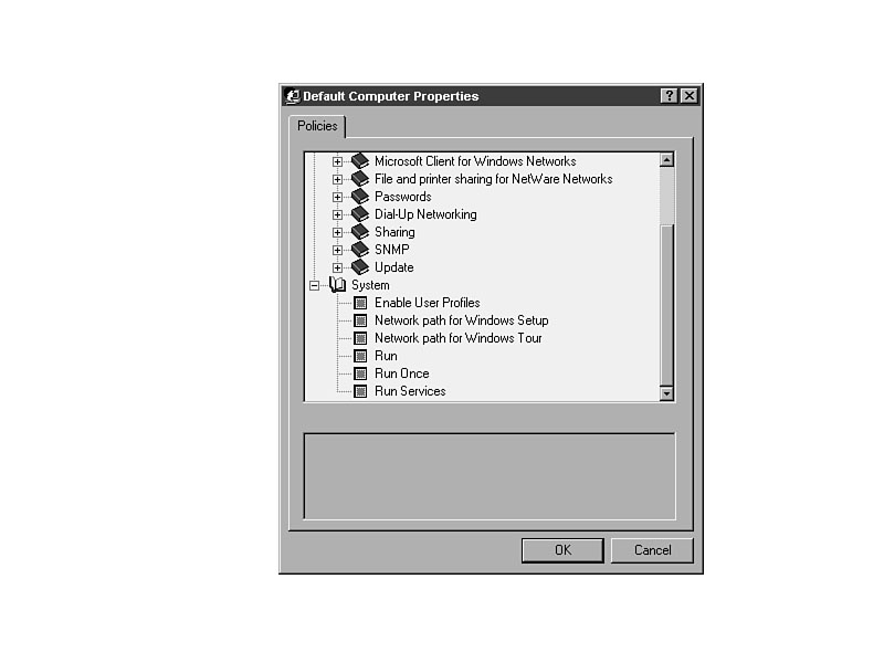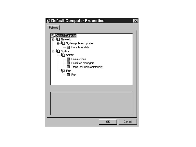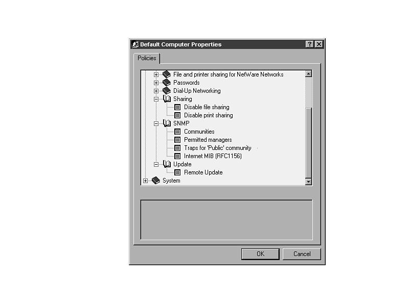 Using COMMON.ADMCOMMON.ADM is the template file for Registry entries that are the same for Windows NT 4.0 and Windows 95. Placing these entries in a single file reduces the likelihood of error and duplication. In the System Policy Editor, these entries are shown with no designation for the operating system. The entries in COMMON.ADM (shown in Figure 29.6) that affect the computer system settings are limited to the location of the policy file, SNMP (Simple Network Management Protocol), and executable files to run at startup.