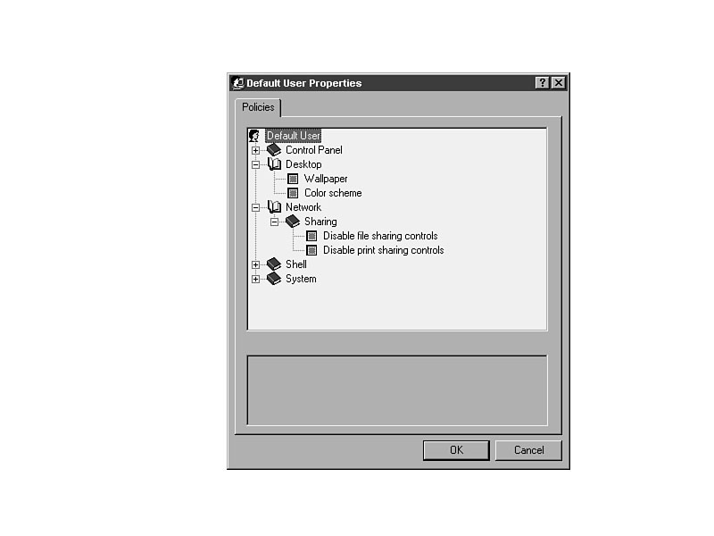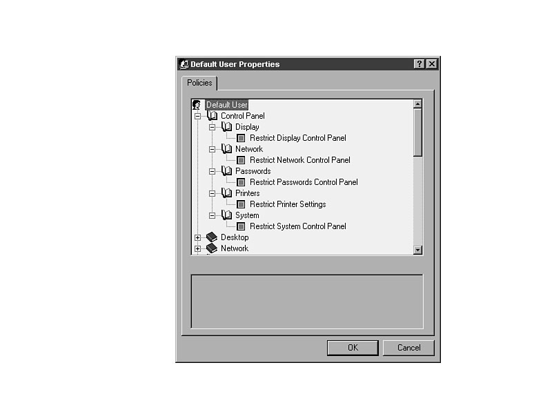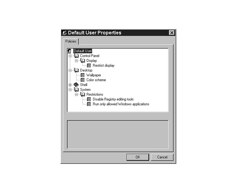 As you can see in Figures 29.7 and 29.8, many more entries are associated with users than with the computers in COMMON.ADM. Most of the system-specific entries are also associated directly with the operating system. Figure 29.6. System-specific entries in COMMON.ADM. Figure 29.7. User-specific entries in COMMON.ADM. Figure 29.8. User-specific Shell Restriction entries in COMMON.ADM.