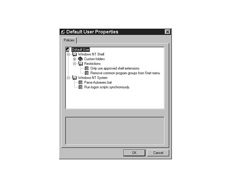 Together, COMMON.ADM and WINNT.ADM provide the framework for settings for system and user restrictions with System Policy Editor. Figure 29.12. User options in WINNT.ADM. Figure 29.13. More user options in WINNT.ADM.