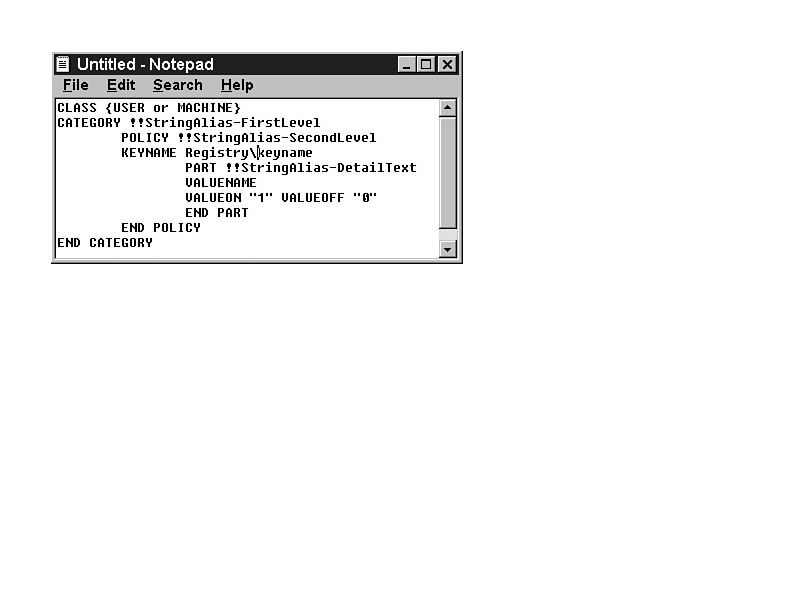 ADM File StructureThe required syntax for a template file is critical for understanding current files and for creating new files. CLASS, KEYNAME, and VALUENAME hold the actual information that will change the Registry. CATEGORY, POLICY, and PART are used to create the interface of the System Policy Editor. CLASSThis setting determines whether the change affects HKEY_LOCAL_MACHINE or HKEY_CURRENT_USER (for the named user). As many categories as desired can be under this heading. CATEGORYThis setting sets the text for initial headings and groups multiple policies for ease of use and editing. CATEGORY settings are shown in the System Policy Editor as a book. There can be as many layers of categories as desired, because they are used to create the hierarchical structure in the interface. An END CATEGORY entry is required to close the CATEGORY. POLICYPOLICY entries are the actual selections that you can choose. They are shown with a check box. An END POLICY entry is required to close the POLICY. KEYNAMEFor each of the policies, there needs to be a key name and at least one value. The KEYNAME entry does not include the handle key name.