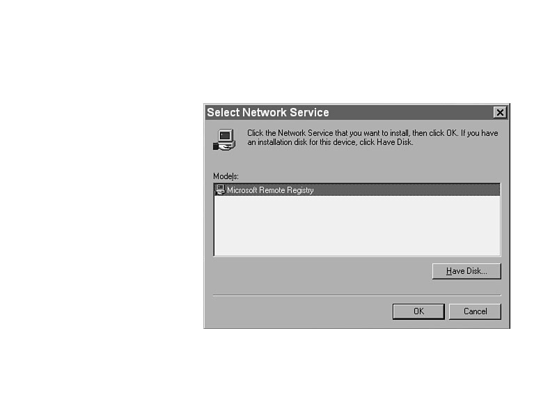 In turn, open the Registry of every machine with File | Connect and repeat steps 3 through 9 for each one. Allowing Policies to Update Windows 95 SystemsIn order for a Windows 95 system's Registry to be updated by System Policy Editor, that system must have Remote Administration enabled, and it must be running the Remote Registry Service. Add the Remote Registry ServiceRemote Registry Service does not automatically get installed with Windows 95. To install the service, which is available only on the CD-ROM, do the following: