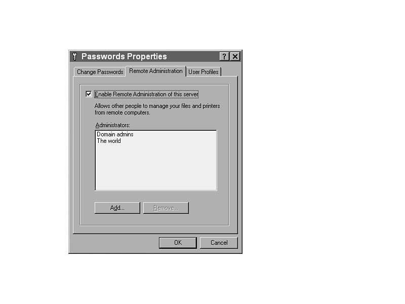 Start the Remote Administration ServiceIn order to start the Remote Administration Service on the Windows 95 system, go to the Passwords section of the Control Panel. Select the Remote Administration tab and click Enable Remote Administration on this server. (See Figure 33.6.) Figure 33.6. Setting up Remote Administration on a Windows 95 system.