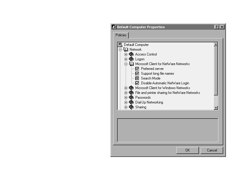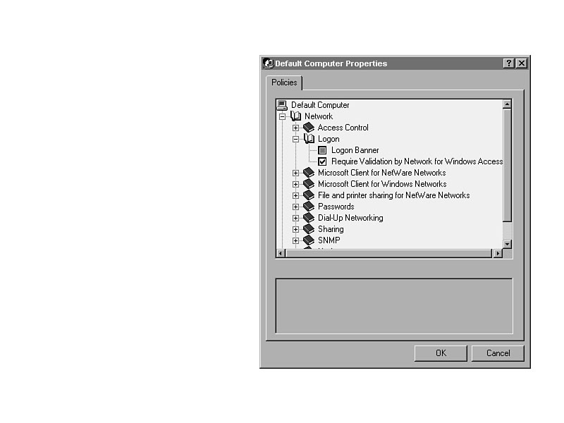 Network/Logon/Require Validation by Network for Windows AccessWithout this setting shown in Figure 33.8 turned on, users could press Esc at the logon dialog box and enter Windows NT, even though they could not access network resources. Figure 33.8. Preventing the circumvention of network logon.Network/Microsoft Client Service for NetWare Networks/Preferred Server