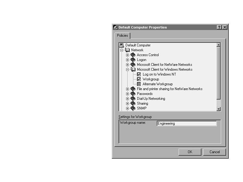 If you would like to have the policy file in a different location, you can change the location by changing the Registry through System Policy Editor. On a workgroup network, where there is no central server, this setting would be required to implement policies. To change the location and/or the name of the file to look to for policies, use the following steps. If you have not yet installed the System Policy Editor files from the Windows 95 CD-ROM, see Chapter 28, "System Policy Editor: Understanding Policy Files."