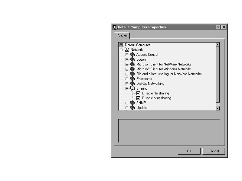 Network/Passwords/Hide Share Passwords with AsterisksIf this setting is turned on, share passwords that include an asterisks will be hidden to others. Figure 33.16 illustrates this setting, as it does the next three settings. Figure 33.16. Password settings in ADMIN.ADM.