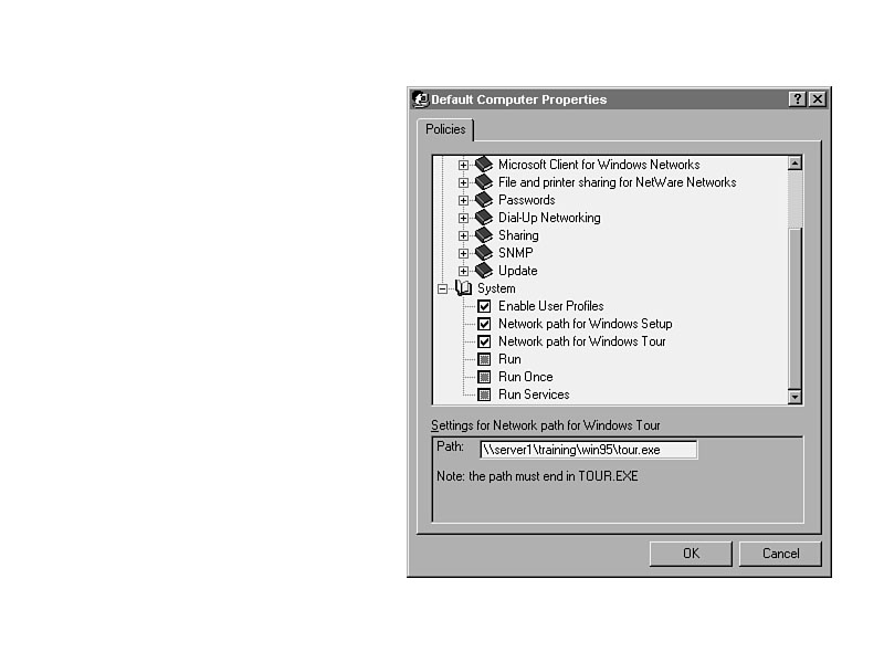 System/Network Path for Windows TourWindows 95 will look for the Tour (the tutorial) at the same location as the Windows 95 operating system files. Set this to a network path, as illustrated in Figure 33.21; there only needs to be one copy on the entire network. It will save a few megabytes on every system, and is well worth it because it usually only gets used once per user anyway. Figure 33.21. Setting the central location of the Tour files.