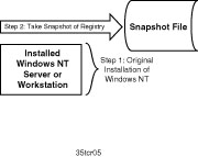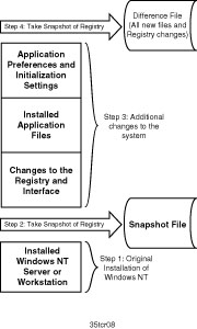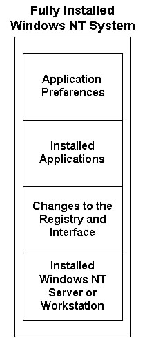 The best option is to take a currently setup system, get everything exactly as you would like it, and clone it (except for the SIDs discussed previously). Then you could use that procedure over and over to make your installation work more easily, faster, and error-free. What you want to achieve is shown in Figure 35.1. In the past, Computer Profile Setup was included with the Windows NT 3.51 Resource Kit. Unfortunately, even though it did a passable job, it had too many limitations, particularly in relation to long filenames and hardware differences. It was difficult to use, and didn't always create unique SIDs for the systems. The complexity and undependable results made it unusable for most organizations. Now, however, SYSDIFF.EXE is available to help you clone your system. Figure 35.1. A fully installed system. SYSDIFF.EXENT 4.0 Server offers a new deployment tool called SYSDIFF.EXE, which is designed to allow quick and easy system cloning. SYSDIFF.EXE does not install or help install the operating system--just all of the modifications, applications, and changes. It can help make the necessary interface changes and connections to the network and shares. It can also help install the application files and implement the necessary Registry changes associated with those files. SYSDIFF.EXE allows you to perform these tasks in two ways. You can combine the changes to the Registry with the binary files required to run the applications into one item called a difference file (it is the difference between the original system and the system after all modifications), then copy the difference file to the new system. That process is outlined in the section titled "Cloning Step by Step." An illustration of this method is shown in Figure 35.2. Alternatively, you can use the cloning tool to make only Registry changes, which will create an .INF file. You then copy the actual files another way, by performing a backup-and-restore or by recording the files on a CD-recordable drive, and copy them to the target system. That option is outlined in the section titled "An Alternative Procedure for Installing Files on the Target System." Figure 35.3 illustrates this type of installation. Whether you include all the actual programs and auxiliary files or not, when you decide to clone your system, the most critical part is the Registry. Figure 35.2. Easy installation with a difference file. Figure 35.3. Using separate application and .INF files for a clone installation.