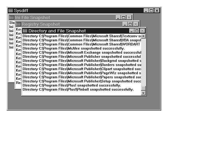Streamlining the SYSDIFF ProcessThe SYSDIFF process is controlled by the SYSDIFF.INF file included with SYSDIFF.EXE on the CD-ROM. By editing the SYSDIFF.INF file, you can make the cloning process smoother, faster, and more space-efficient. The SYSDIFF.INF file is basically an inclusion/exclusion file that determines what will or will not be reviewed. The file on the CD-ROM has nine sections: [Version] [ExcludeDrives] [ExcludeDirectoryTrees] [ExcludeSingleDirectories] [ExcludeFiles] [IncludeFilesInDir] [ExcludeRegistryKeys] [ExcludeRegistryTrees] [ExcludeRegistryValues] Entries in the SYSDIFF.INF file (as long as the file is in the same directory as SYSDIFF.EXE) will direct the cloning process. For example, if you chose to add the drive letter "E" to the [ExcludeDrives] section, it would not even look there for the snapshot or the difference file. That could save a lot of time in the process if there was nothing there to be used. Be very careful about removing any of the default entries in the SYSDIFF.INF file. Doing so may make the cloning process unsuccessful. An Alternative Procedure for Installing Files on the Target SystemThe difference file contains all the Registry changes, the .INI file