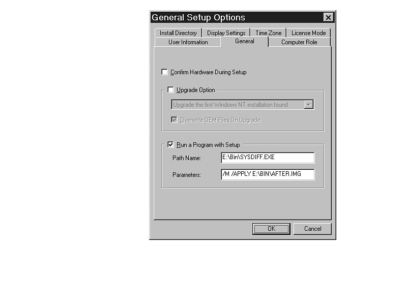 Combining the Installation and Cloning ProcessesA great shortcut to increase performance when working with cloning is to combine the installation process and the cloning process into one command by using SYSDIFF.EXE. The entire process is controlled by the answer file created by SETUPMGR.EXE, as shown in Figure 35.15, for unattended installation. Using SETUPMGR.EXE to create a text file with all the answers you normally have to give during the Windows NT installation routine can be a great time-saver. Figure 35.15. The unattended answer file launches SYSDIFF.EXE to complete the installation.