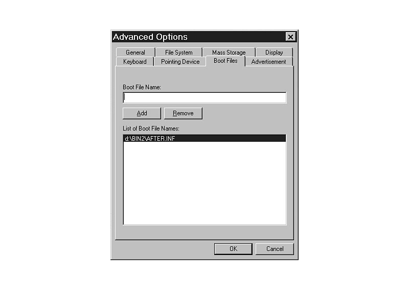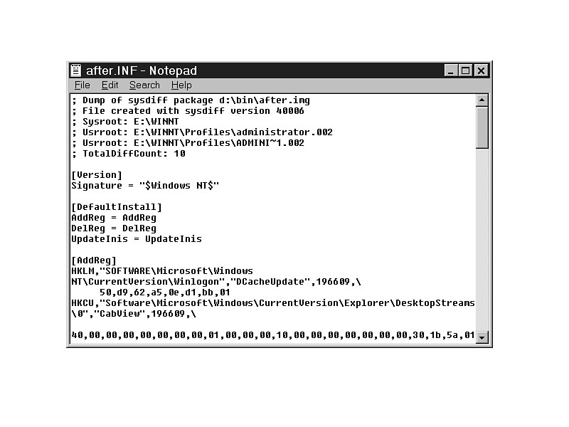 To use this alternate procedure, perform steps 1 through 11 to create the difference file and prepare the target system for file installation. Instead of using the difference file to install the software, split the file between the .INF file (which will update Registry and .INI files) and the actual program and data files. Create an .INF FileTo create the .INF file, use the Start | Run function and type D:\Bin\SYSDIFF.EXE /inf d:\bin\after.img d:\bin2. D:\bin\after.img is the path and name of the difference file, and d:\bin2 is the location for the .INF file and the changes to the system. The .INF file is given the same name as the difference file, except that the .INF file has an .INF extension (in this case, AFTER.INF). The contents of the .INF file are readable in Notepad or in any other text editor or word processor, and are shown in Figure 35.17. Figure 35.17. Text listing of the .INF file. Use the .INF File to Change the RegistryMake changes to Registry and .INI files on the target system by adding the .INF file to the list of files to use at installation. SETUPMGR.EXE has an easy way of including it, as shown in Figure 35.18. Start SETUPMGR.EXE and choose Advanced Options. Select the Boot Files tab. Add the path and name of the file. When Windows NT is installed using the answer file, the Registry and .INI file changes are made automatically. Figure 35.18. Adding the .INF file to the answer file in SETUPMGR.EXE. Copy the Directories and Files to Complete the InstallationFor your convenience, the .INF file-creation procedure also copies all files included in the difference file into subdirectories (as shown in Figure 35.19). When the files are copied into the $OEM$ subdirectory, the date on the files changes to the current date. Using the files in the $OEM$ directory may compromise your security if you are using any date-stamping for your files. Even though the files have been copied into the $OEM$ directory, you don't need to include them in the installation process. Instead of copying and using the files in the $OEM$ directory, install NT with an answer file, then copy the originals with XCOPY.EXE, and the dates and times will be preserved. Figure 35.19. All files from the difference file are copied into directory structures for easy copying to the target system. Use the .INF File for Backup of Software Registry EntriesThe .INF file can also be used in the event of a Registry problem with an application. Normally, you would need to reinstall, then make the necessary changes to the menus, toolbars, and preferences. However, if you could have a list of every change the installation and modification made to the Registry and .INI files, it would save a tremendous amount of time. If you create a difference file after you install an application, you have the information you need. Create a loadable .INF file from the difference file. With that file, you can repair the Registry. If the application's Registry entries become corrupted, load the .INF file back into the system. Instead of reinstalling the current Windows NT, choose to do an update, including the .INF file in the Advanced Options | Boot Files section of SETUPMGR.EXE. The Registry will be updated with the .INF file information. Possible Error MessagesOf course, something could go wrong, and, unfortunately, there is very little documentation on this process. Here are some of the more common problems and their solutions. Computer Hangs During the SYSDIFF/APPLY OperationThis will usually happen because of a lack of disk space or there is a problem with the difference file (either corrupted, or a part of the application or data files is bad). Check for disk space on the target system (where the applications will go). If it is insufficient, you will have this problem. If there is plenty of disk space, try manually installing the difference file from the local system instead of across the network. If that doesn't work, re-create the difference file. Error Message: System Error 5When SYSDIFF.EXE attempts to enter restricted areas of the Registry, you may get this message. Edit the SYSDIFF.INF file to exclude sections of the Registry that are off limits. Error Message: Diff Failed (Error 2)This is a syntax error on the command line when the /DIFF option is used. Check the step-by-step instructions and try again. Error Message: Diff Failed (Error 32)Error 32 indicates an open file error. The files could be open because applications are in use, or the system has opened other applications.