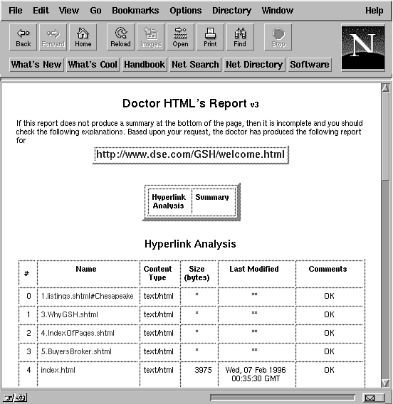 There are several checks you will want to make once the pages are accessible over the Net. To become familiar with these checks, start with Doctor HTML at http://imaginware.com/RxHTML.cgi. Doctor HTML lets you run multiple tests, including a spell checker, a simple structure validator, and a rough performance tester. (Figs. 1.9 through 1.11 show a sample run with Doctor HTML.)