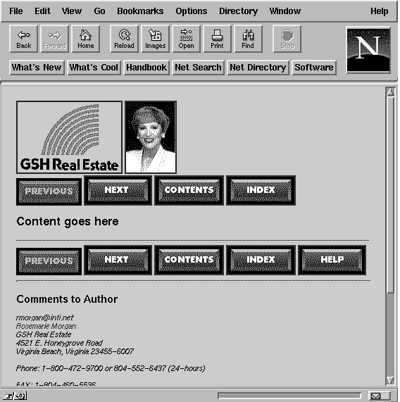 <HTML> <HEAD> <TITLE>GSH: Welcome!</TITLE> </HEAD> <A HREF="Homeowners/3.WhyGSH.html"><IMG ALT="GSH Logo" SRC="Graphics/gshlogo.gif"</A> <A HREF="Homeowners/4.WhoIsRose.html"><IMG ALT="Rosemarie Morgan" SRC="Graphics/rose.gif"></A> <BR> <IMG ALT="Previous Page" SRC="Graphics/previousG.gif"> <A HREF="General/2.Credits.shtml"><IMG ALT="Next Page" SRC="Graphics/next.gif"></A> <A HREF="welcome.html"><IMG ALT="Contents" SRC="Graphics/contents.gif"></A> <A HREF="General/4.IndexOfPages.shtml"><IMG ALT="Index" SRC="Graphics/index.gif"></A> <P> <H1>Content goes here</H1> <HR CLEAR=left> <IMG ALT="Previous Page" SRC="Graphics/previousG.gif"> <A HREF="General/2.Credits.shtml"><IMG ALT="Next Page" SRC="Graphics/next.gif"></A> <A HREF="welcome.html"><IMG ALT="Table of Contents" SRC="Graphics/contents.gif"></A> <A HREF="General/4.IndexOfPages.shtml"><IMG ALT="Index" SRC="Graphics/index.gif"></A> <A HREF="General/3.Help.shtml"><IMG ALT="Help" SRC="Graphics/help.gif"></A> <HR> <H3>Comments to Author</H3> <ADDRESS> <A HREF="mailto:rmorgan@infi.net"> rmorgan@infi.net</A><BR> <A HREF="http://www.dse.com/GSH/">Rosemarie Morgan</A><BR> GSH Real Estate<BR> 4521 E. Honeygrove Road<BR> Virginia Beach, Virginia 23455-6007<BR> <P> Phone: 1-800-472-9700 or 804-552-6437 (24-hours) <P> FAX: 1-804-460-5536</ADDRESS> <HR> <PRE>All contents Copyright © 1995 Rosemarie MorganAll rights reserved.</PRE> <P> <A HREF="http://www.halsoft.com/html-val-svc/"><IMG SRC="Graphics/valid_html.gif" ALT="HTML 2.0 Checked!"></A> <A HREF="http://stats.internet-audit.com/cgi-bin/stats.exe/0001222"> <IMG ISMAP BORDER=0 SRC="http://g1.internet-audit.com/act/ZQ0001222.gif" ALT="Make your visit count, load this image."></A> <BR> <H6>This web site produced by <A HREF="http://www.dse.com/welcome.html">DSE, Inc.</A></H6> Last modified: <EM>February 6, 1995</EM><BR> URL: <EM>http://www.dse.com/GSH/welcome.html</EM> </P> </BODY> </HTML>