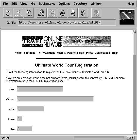 A more elaborate example (still built using a mail form) is the Travel Channel's Ultimate World Tour '96 (see Fig. 11.2), at http://www.travelchannel.com/tv/travelus/ult96/. Travel Channel sponsors this contest each year, suggesting that the giveaway is meeting its expectations.