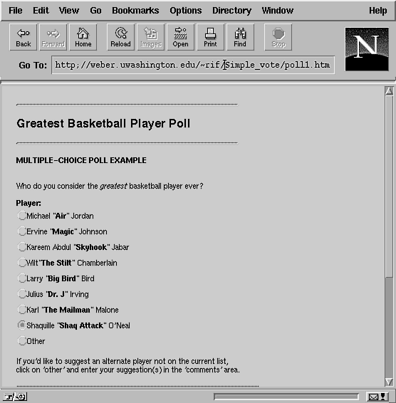 Listing 11.2 shows a similar program from the same author; this one captures text-based data. It works with the HTML form at http://weber.u.washington.edu/~rif/Simple_vote/poll.html. Figure 11.5 shows that form.