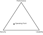 Security is not without cost. Figure 17.1 illustrates the fact that one can achieve security only at the expense of ease-of-use and performance. A Webmaster can choose any operating point within this triangle but cannot be at all three corners simultaneously.