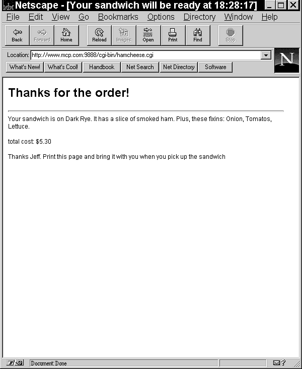The CGI script hamcheese.cgi adds up the costs for the sandwich, and tells the user how much it costs and when it's ready (see Fig. 19.10).