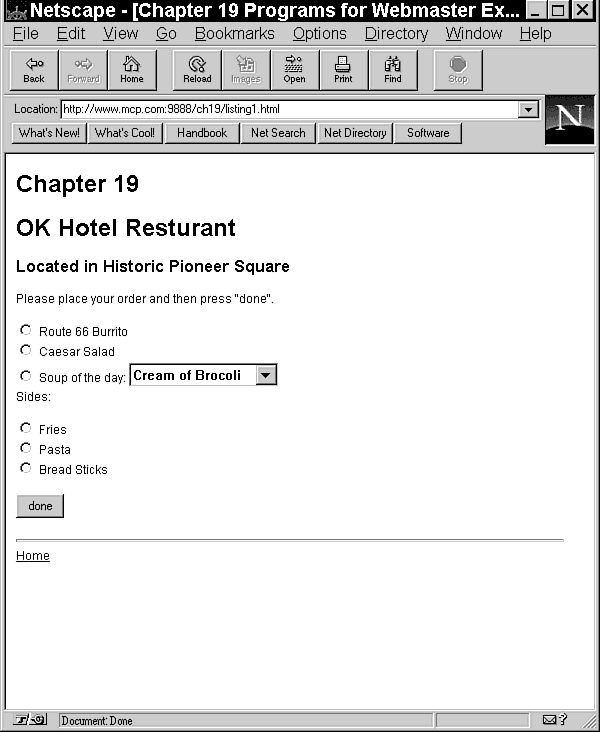 This looks like a good interface (see Fig. 19.9). Nina is using some SSI and an HTML form with different types of data. She starts into the programming of the CGI script to handle this ham and cheese CGI sandwich application. First, she decides that the output of the CGI is going to include the following information. The date and time of the order is placed at the top. Then include the text of a raw text file that contains the standard disclaimer and information that only natural ingredients are used, the phone number, and address of the deli. Finally, she plans on writing the CGI so it will generate a list of what is in the sandwich: the bread, meat (if any), cheese (if any), and the fix-ins.