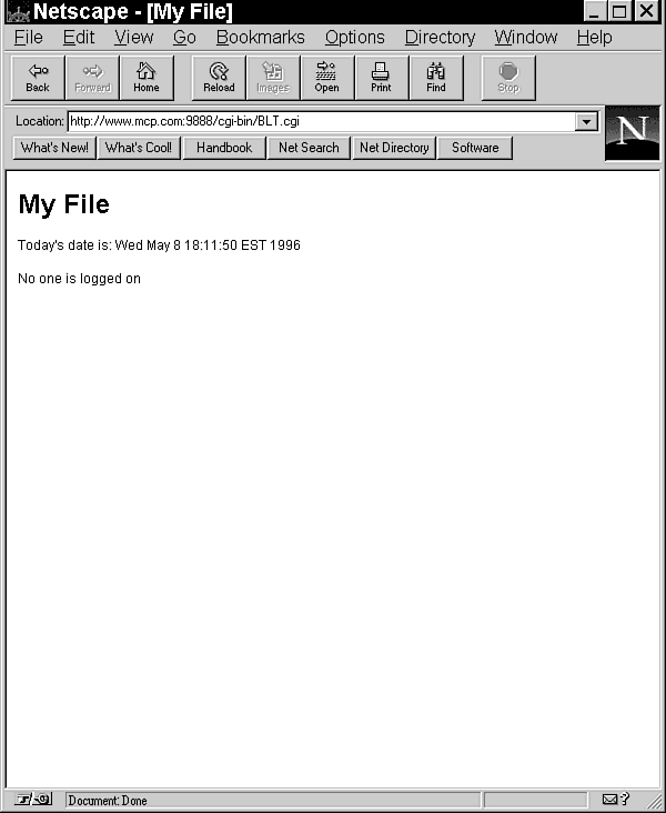 Like magic, the pages are created in that the page is downloaded to the client just as any other static page is loaded by a client. Web browsers are client programs that do interesting things. We have browsers that can read e-mail, UseNet groups, even play sound and video. But behind all those features, the browser is an HTML viewer. The browser accepts all kinds of documents: GIFS, Shockwave pieces, sound files, and HTML files. Pages generated by CGI scripts are made on the fly the instant the user loads a CGI script URL.