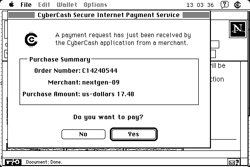 Sites running DigiCash's programs can both accept and pay out electronic money. If the shop is connected to a real bank (this is, it is denominated in real money), be sure to set a password. |