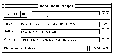 Follow the Library link to the audio files and search for a keyword or phrase like "Bosnia." The system finds several speeches in which that word appears. Now open one of the speeches and follow one of the links. (The URL will look something like http://www2.whitehouse.gov/cgi-bin/audio-retrieve?file=ROTP/1996-01-13.ra&time=0%3A35.59. An example of the page is shown in Figure 34.12.)
