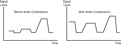 During the recording process, the levels are set so that the highest peaks do not exceed the maximum level of the equipment. For many recording sessions, such peaks are rare, and the average sound level is far below the top of the amplitude range. Use audio compression (not related to file compression) to turn down the peaks so that the overall level of the signal can be increased. Figure 34.8 illustrates audio compression.