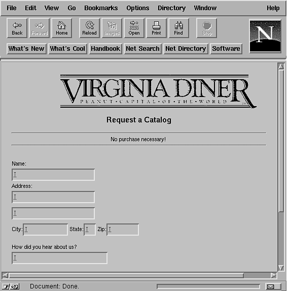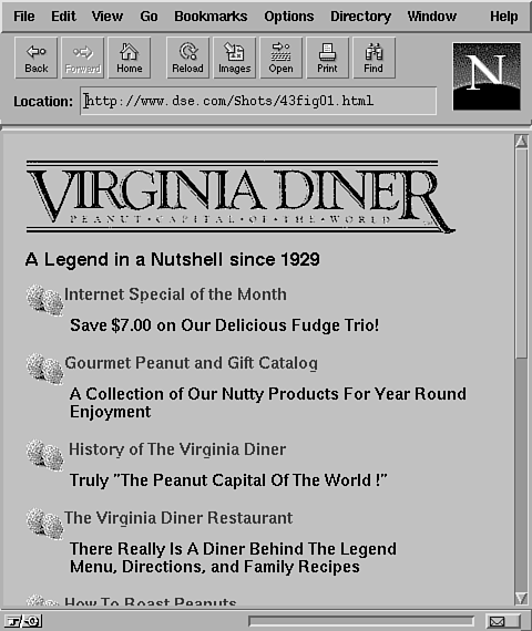 If a site is rich in content, visitors will come to it to learn about the subject-whether it's real estate, jewelry, or peanuts. The Virginia Diner site is a good example, at http://www.infi.net/vadiner/. The Virginia Diner is a small restaurant in a small town in rural Virginia. By using the Internet, the restaurant does a booming business in gourmet peanuts. Its site (shown in Figs. 41.1 through 41.4) is rich in content about the history and uses of the humble peanut. And, by the way, if reading about these peanuts has got you curious or starts your mouth watering, the diner will sell you some (as in Fig. 41.4).