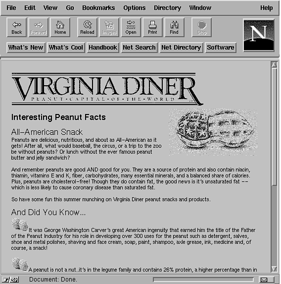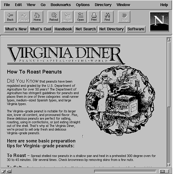 As soon as the visitor comes to the welcome page, he or she is lured away by promises of sales, catalogs, and content. Many sites try to tell their whole story on the first page. Virginia Diner has made their first pages into a "links" page, which draws the visitor deeper into the site quickly. If a visitor is not ready to vuy right away, perhaps they would like to order a catalog. If they need a bit more time to become comfortable with the material, they can visit the content pages, such as the one showing how to roast peanuts (shown in Fig. 41.2) or the "Interesting Peanut Facts" shown in Figure 41.3.